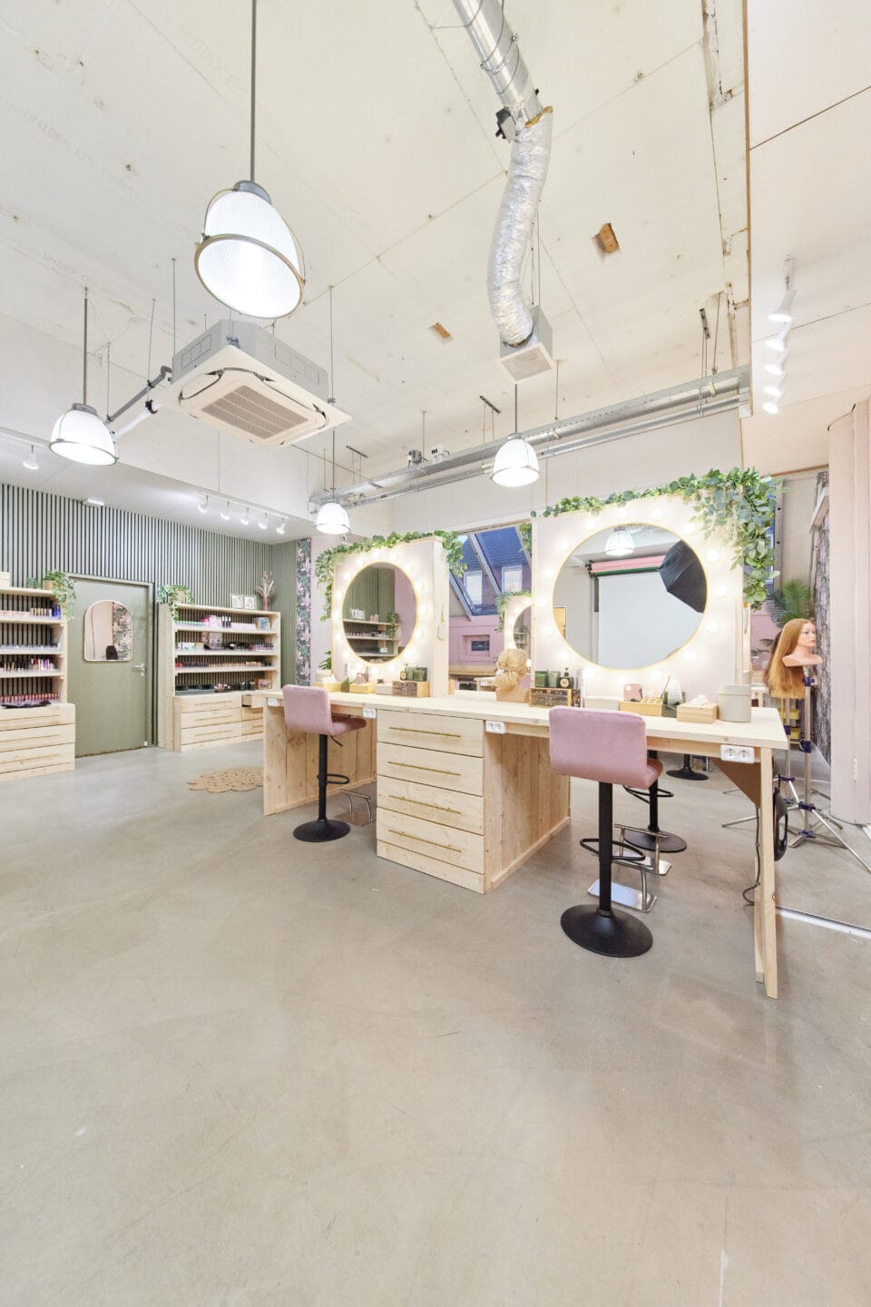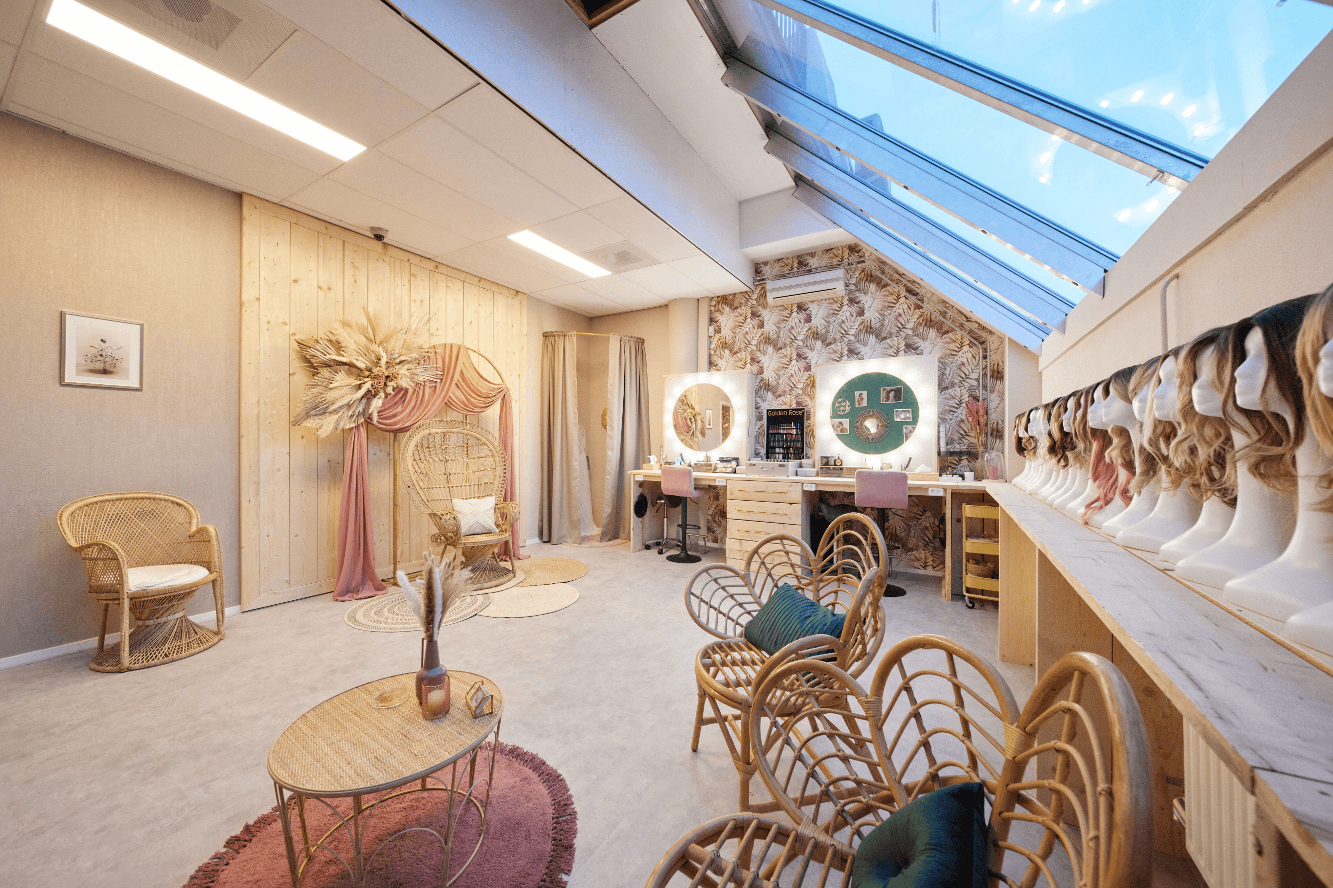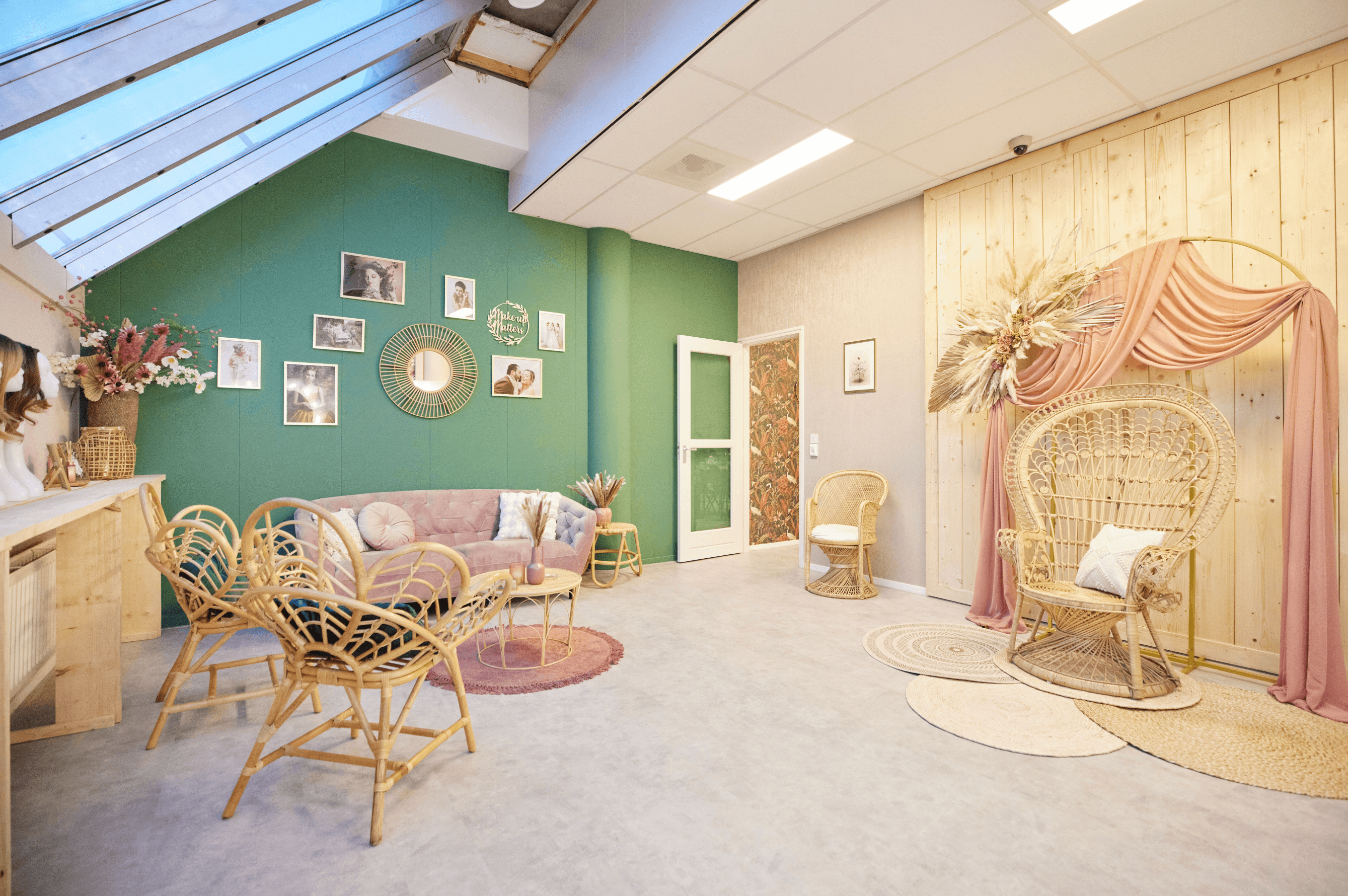 – Onze Boho Room heeft een kaptafel met 2 werkplekken. Hier kan je in alle privacy werken. Deze ruimte beschikt ook over een pashokje en een styled background voor fotografie. Deze ruimte kan gehuurd worden door visagisten/MUAH’s die hier een proefsessie willen verzorgen voor hun bruiden. Maar deze ruimte kan ook verhuurd worden door Crossdressers / Travestie / Non-binair / Transgender klanten die in alle privacy even willen tutten;)
